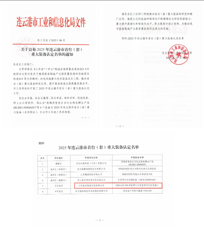 近日,連云港市工業(yè)和信息化局正式公布2025年度市級首臺(套)重大技術(shù)裝備認(rèn)定名單。在本批次認(rèn)定中,江蘇海宏智能科技有限公司自主研發(fā)的“MSO-CR-200新能源汽車智能移動充電機器人”項目脫穎而出,成功入選。